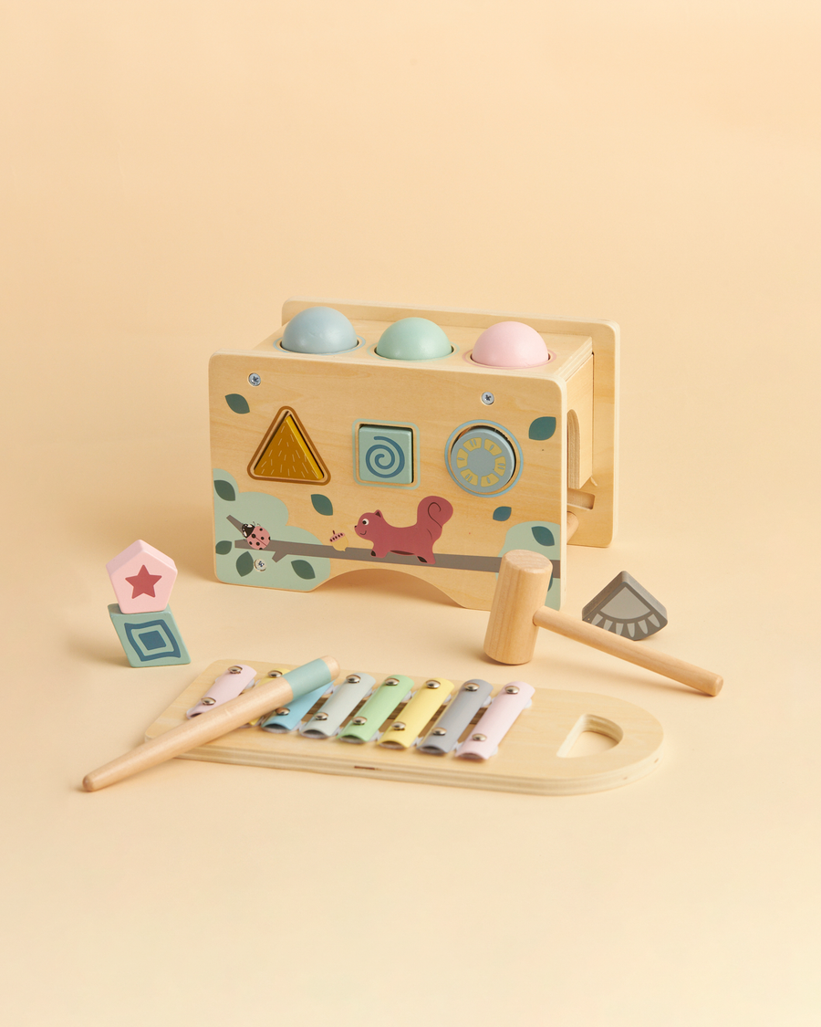 Children can hammer the pastel-colored balls match and insert different shapes into the correct slots and enjoy making music on the xylophone. This toy enhances fine motor skills hand-eye coordination shape and color recognition as well as rhythm and creativity.