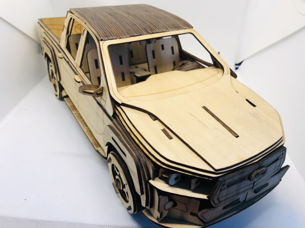 Detailed wooden pickup truck model with laser-cut precision and rolling wheels. Features realistic cabin, open bed, and intricate exterior design. Made from natural wood with smooth edges, ideal for display or imaginative play. Encourages creativity, fine motor skills, and storytelling. Suitable for children from 3 years.