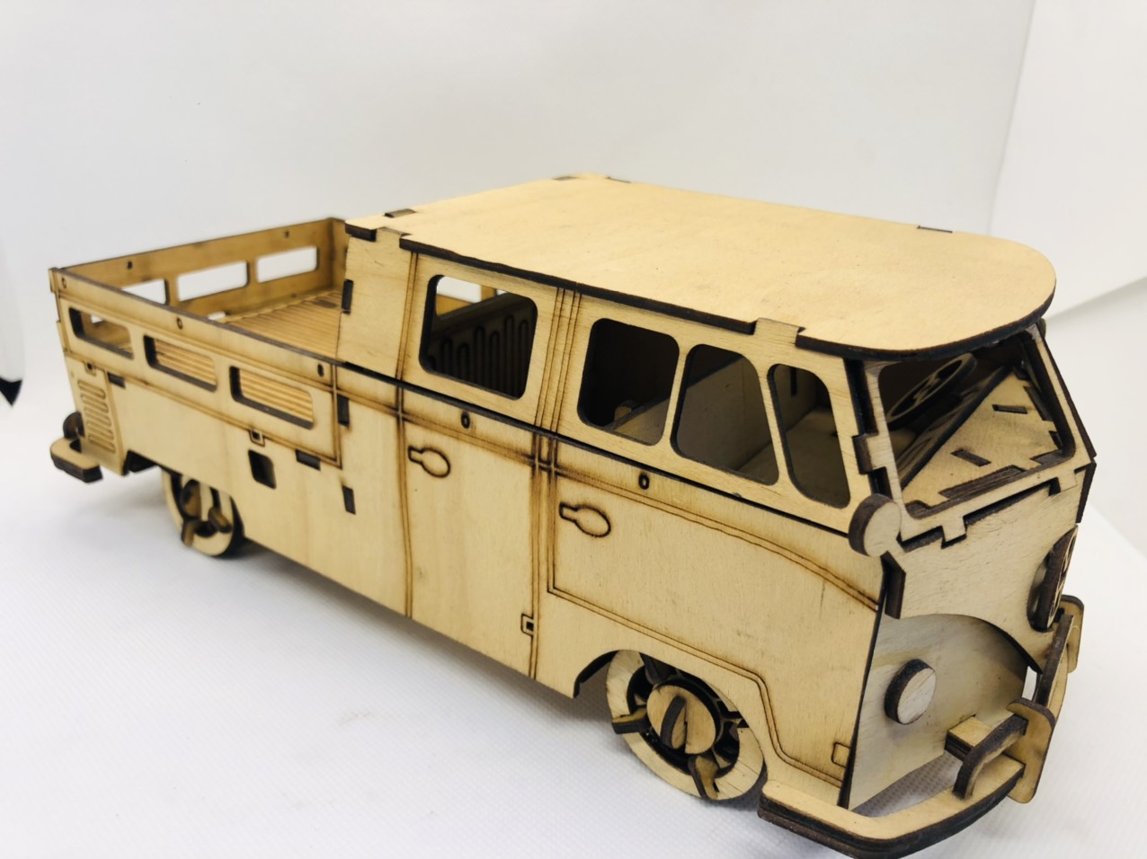 Hand-assembled wooden pickup van with laser-cut details and rolling wheels. Natural wood finish with intricate windows, doors, and cargo area for realistic play. Encourages imaginative play, fine motor skills, and creative storytelling. Ideal for home or preschool play. Suitable for children from 3 years.