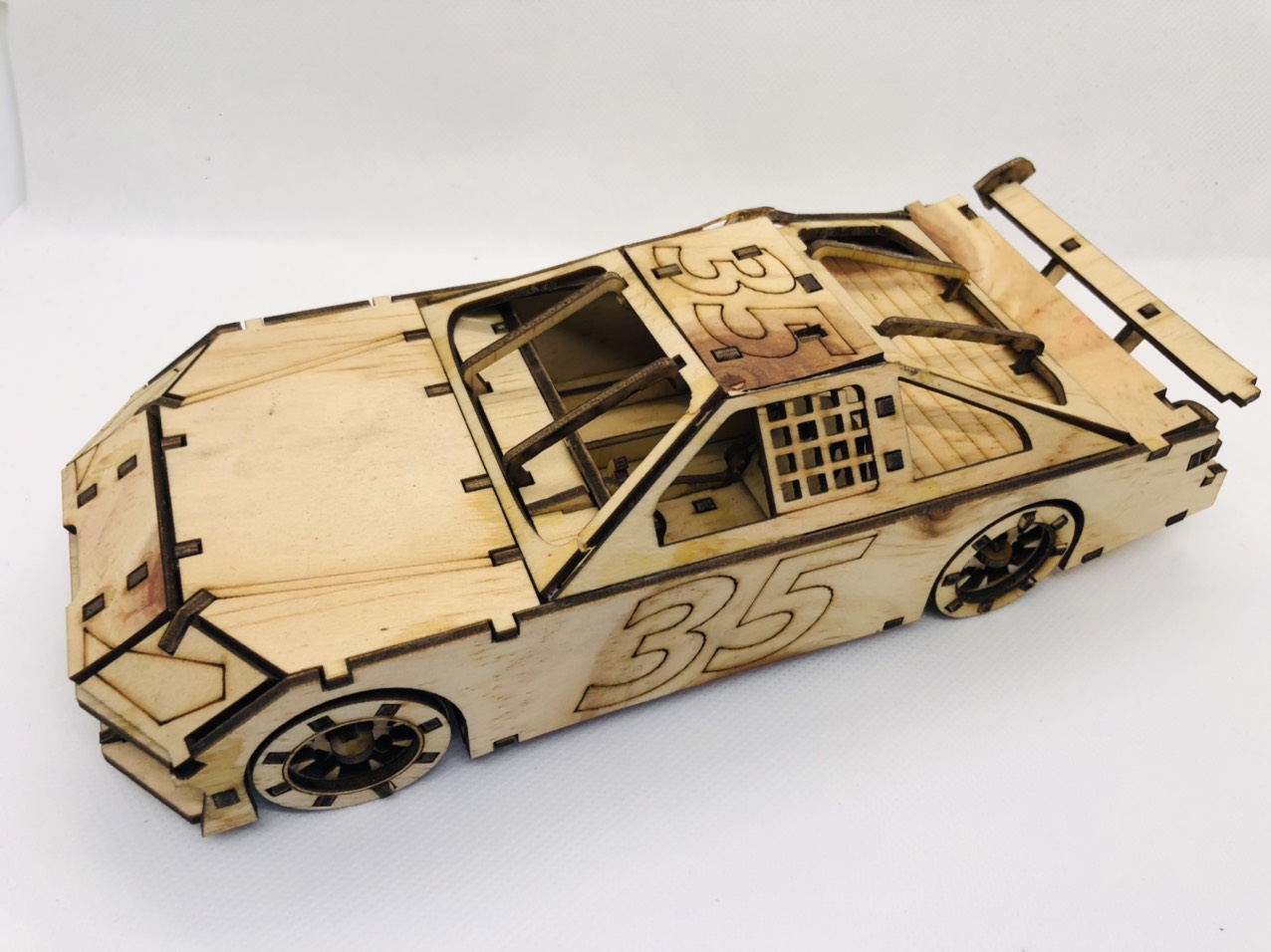 Intricately designed wooden race car with laser-cut details, spoiler, and rolling wheels. Features open cockpit and realistic racing body with number 35 engraving. Made from natural wood with smooth edges, perfect for display or imaginative play. Encourages creativity, fine motor skills, and storytelling. Suitable for children from 3 years.