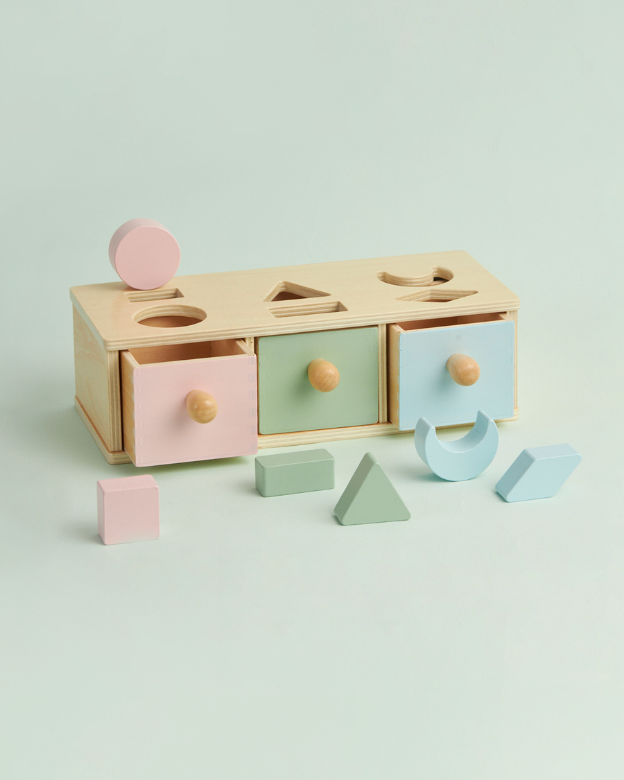 Each block drops into a drawer which children can open to retrieve the pieces – turning shape sorting into a fun surprise game! This 2-in-1 design not only develops shape recognition but also strengthens fine motor skills and hand-eye coordination.