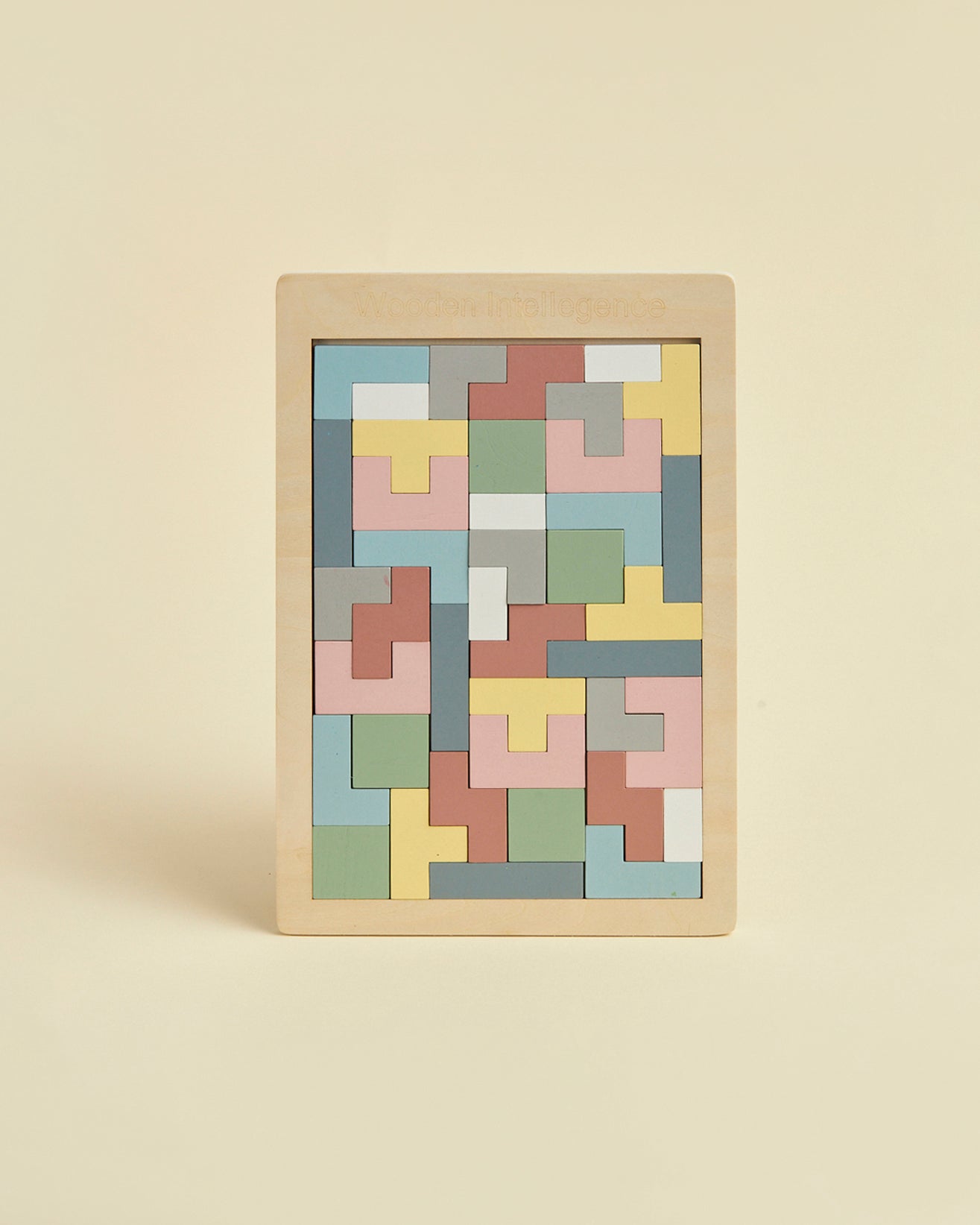 This wooden Tetris puzzle is a Montessori-inspired educational toy designed to challenge children’s problem-solving skills logical thinking and creativity. The set includes multiple pastel-colored wooden blocks in different geometric shapes that can be arranged to fit into the wooden board.